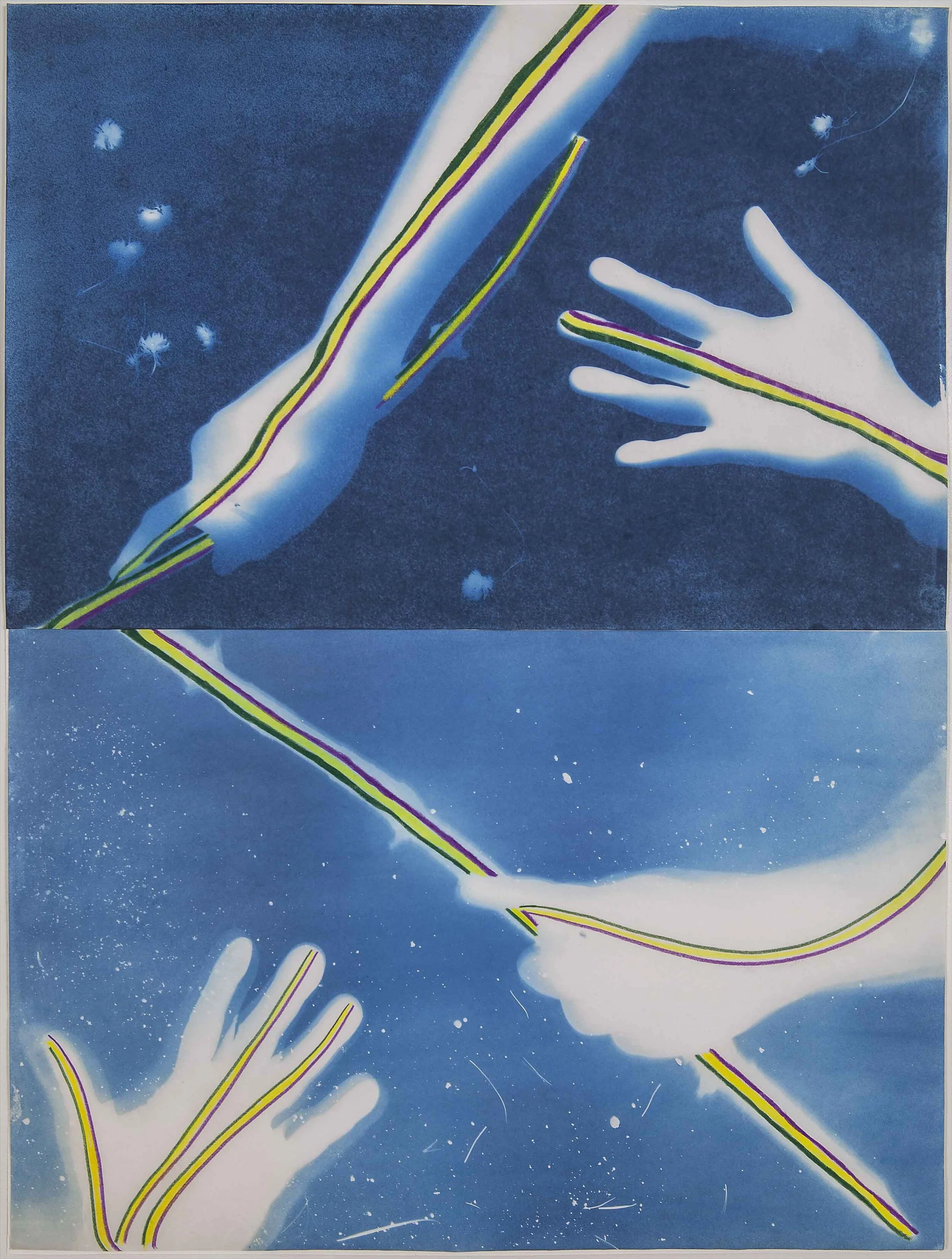 I combine collaboration with chance encounters. Using a light sensitive cyanotype emulsion I expose it with sunlight in collaboration with participants from my local community. Mothers, children, and co-workers having lunch outside helped create the silhouettes of hands playing tug of war with string and sticks. Later, after processing, I draw with water based crayons to echo the colored sashes worn by women marching for suffrage. Purple, yellow and instead of white, I chose green. Green represents the hope for a more equitable future.